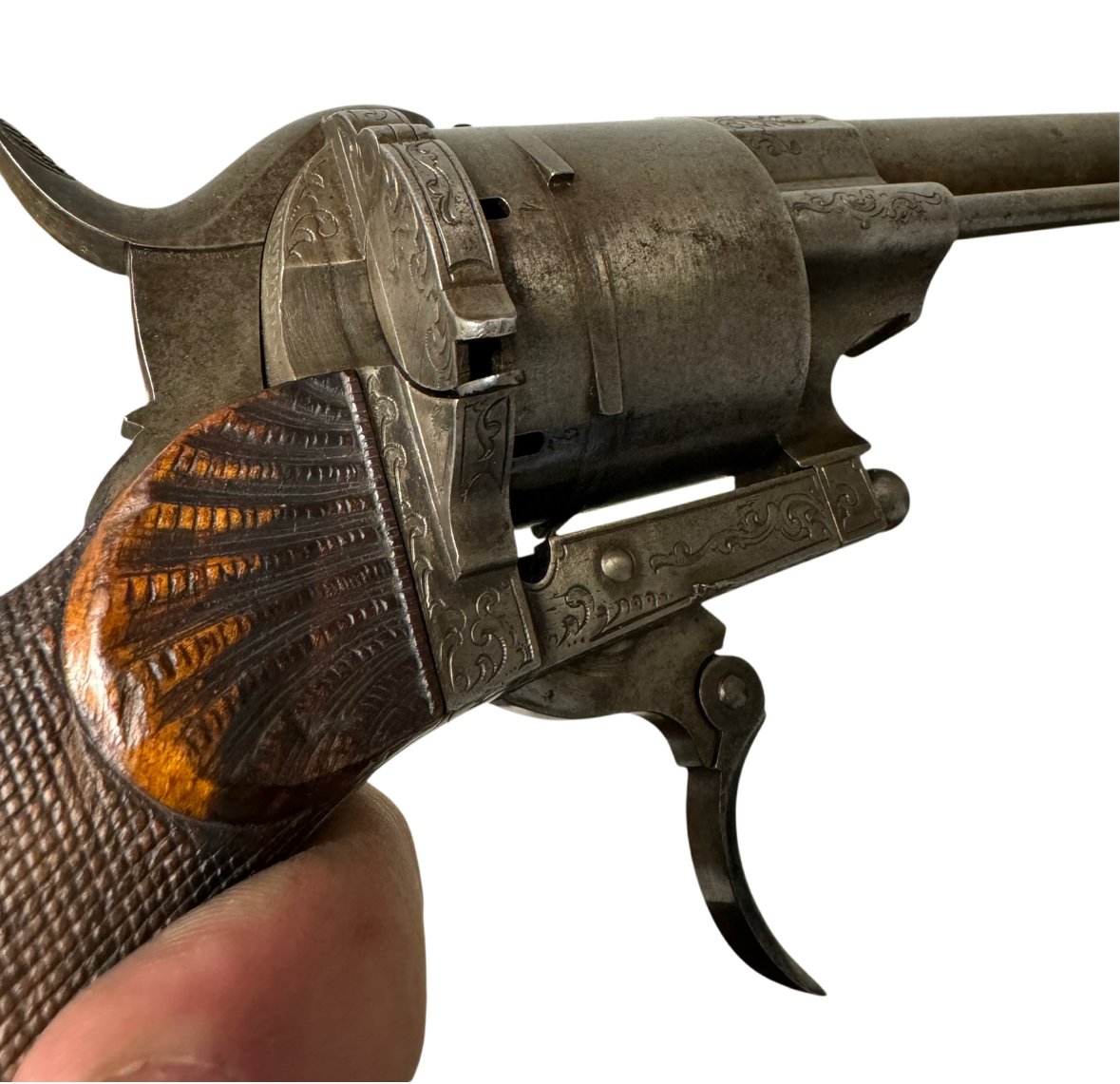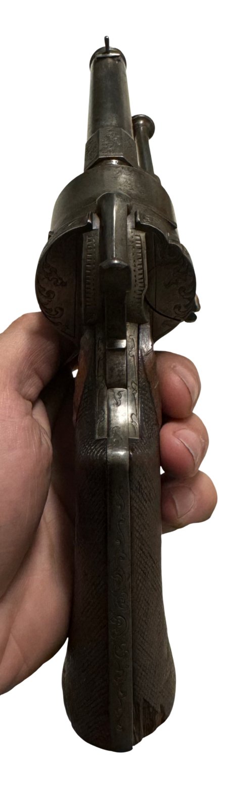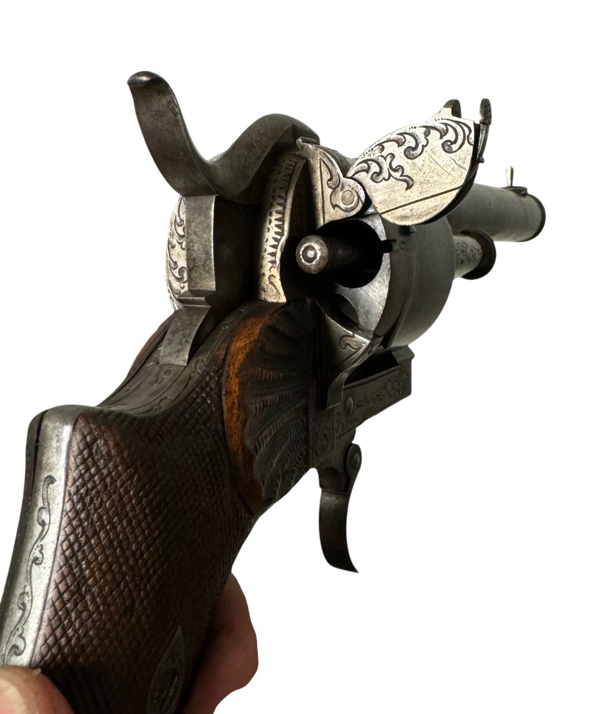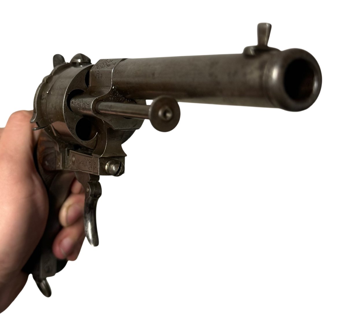 Offering for sale an antique FOLDING TRIGGER PINFIRE revolver chambered in 11mm. This is a fully functional example in very good condition for its age. The frame and cylinder show attractive decorative engraving, and the mechanics operate smoothly in both single action and double action. Very tight action with little play and timing is good