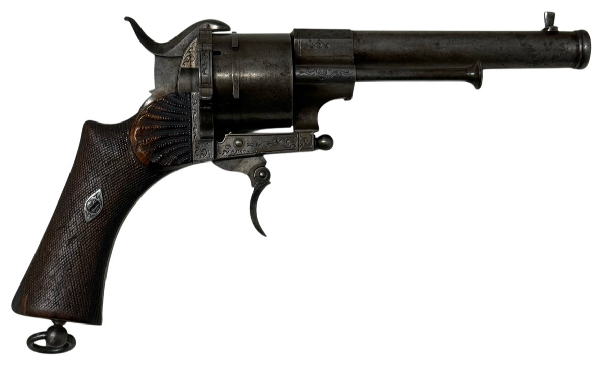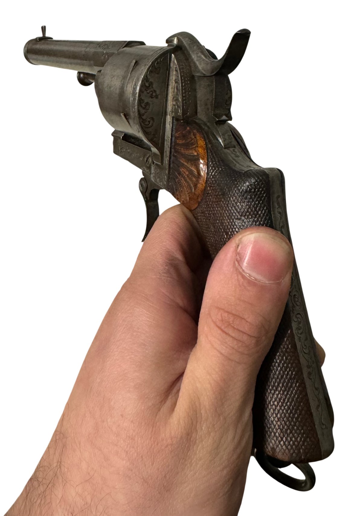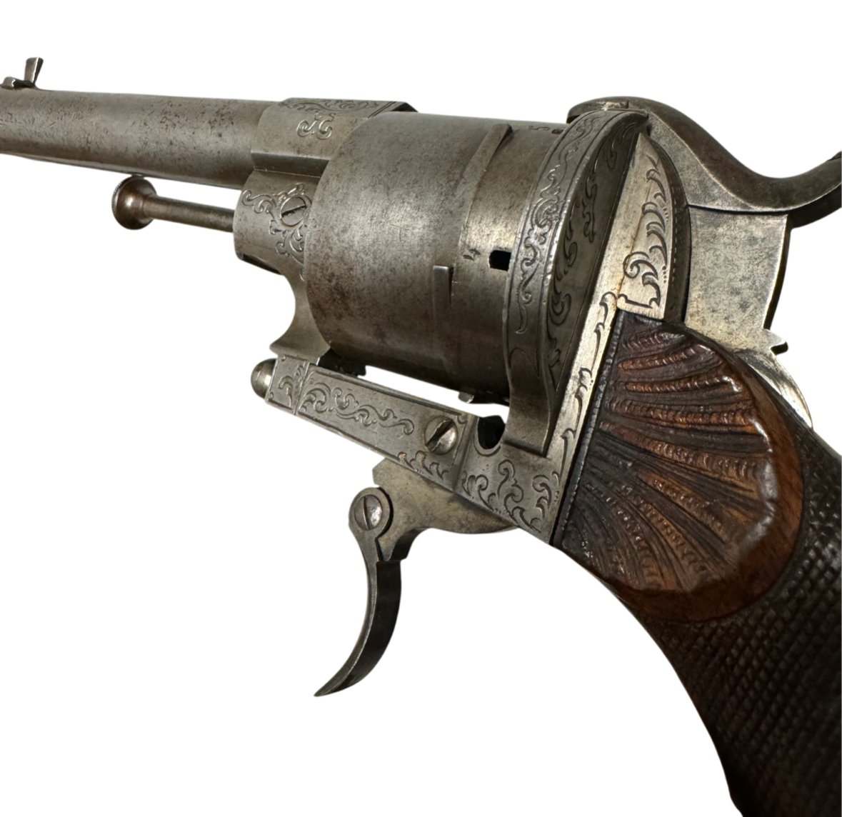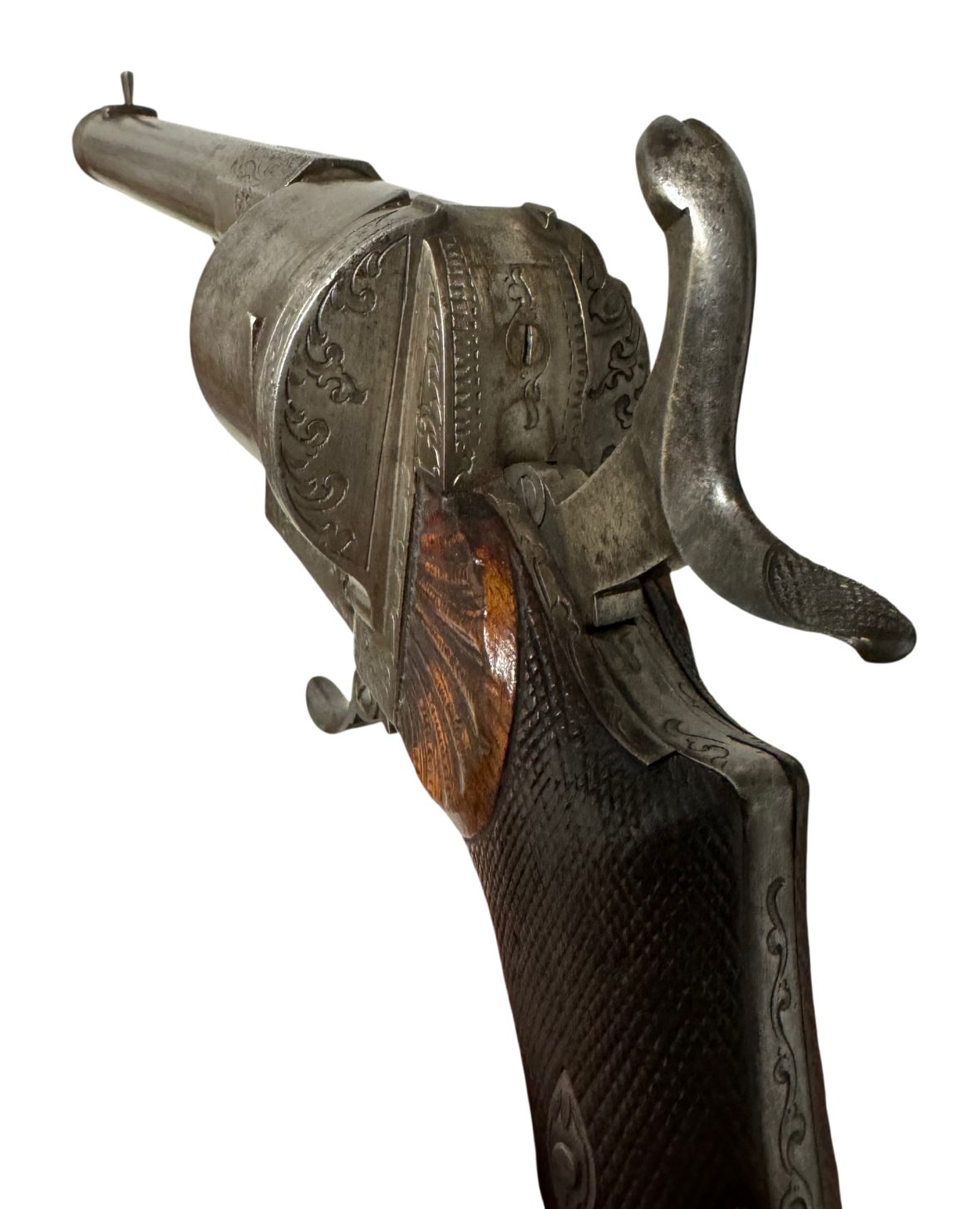 Offering for sale an antique FOLDING TRIGGER PINFIRE revolver chambered in 11mm. This is a fully functional example in very good condition for its age. The frame and cylinder show attractive decorative engraving, and the mechanics operate smoothly in both single action and double action. Very tight action with little play and timing is good