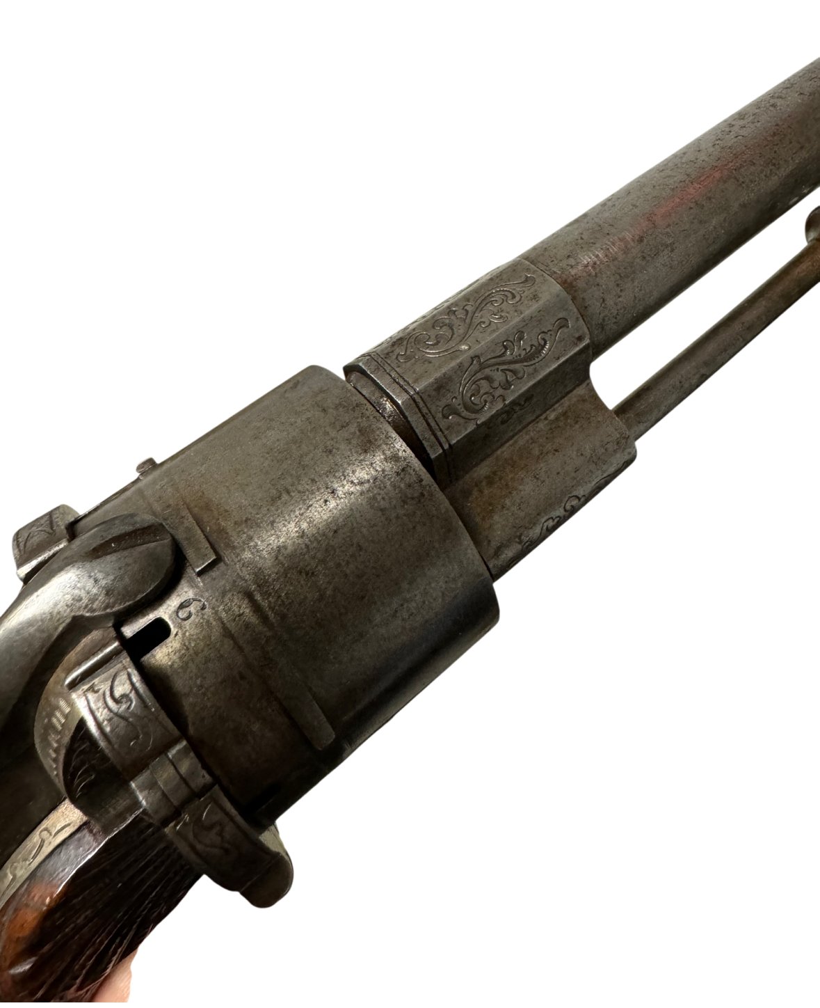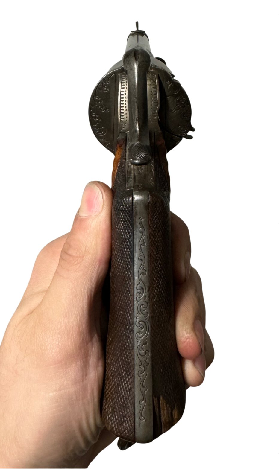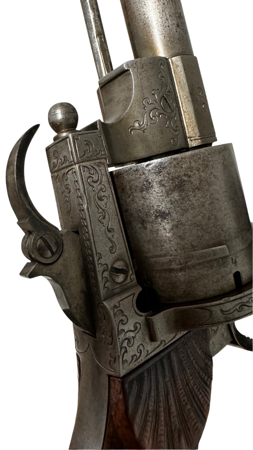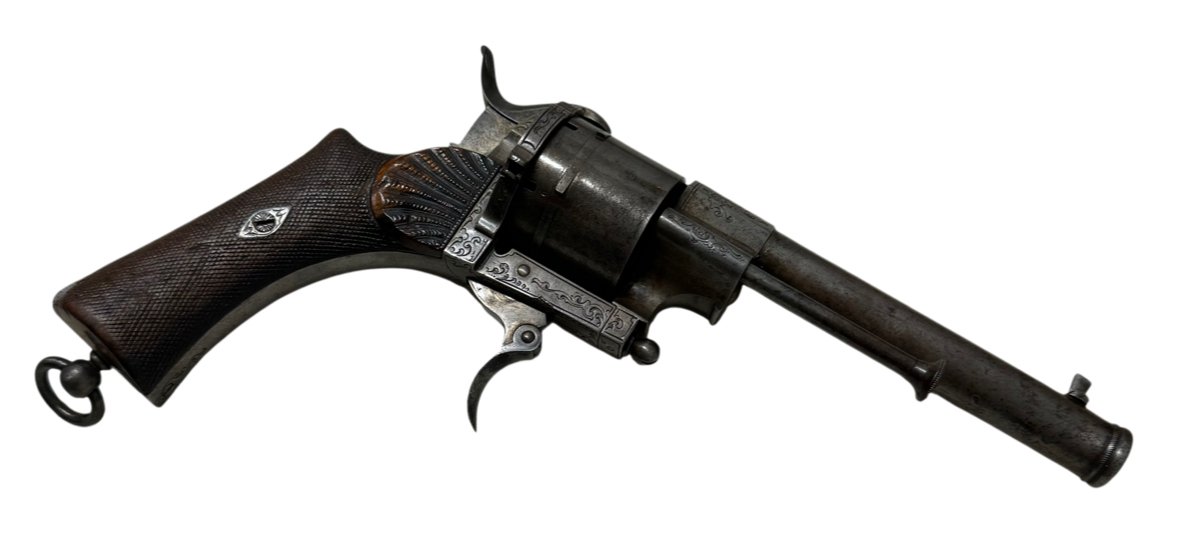 Offering for sale an antique FOLDING TRIGGER PINFIRE revolver chambered in 11mm. This is a fully functional example in very good condition for its age. The frame and cylinder show attractive decorative engraving, and the mechanics operate smoothly in both single action and double action. Very tight action with little play and timing is good
