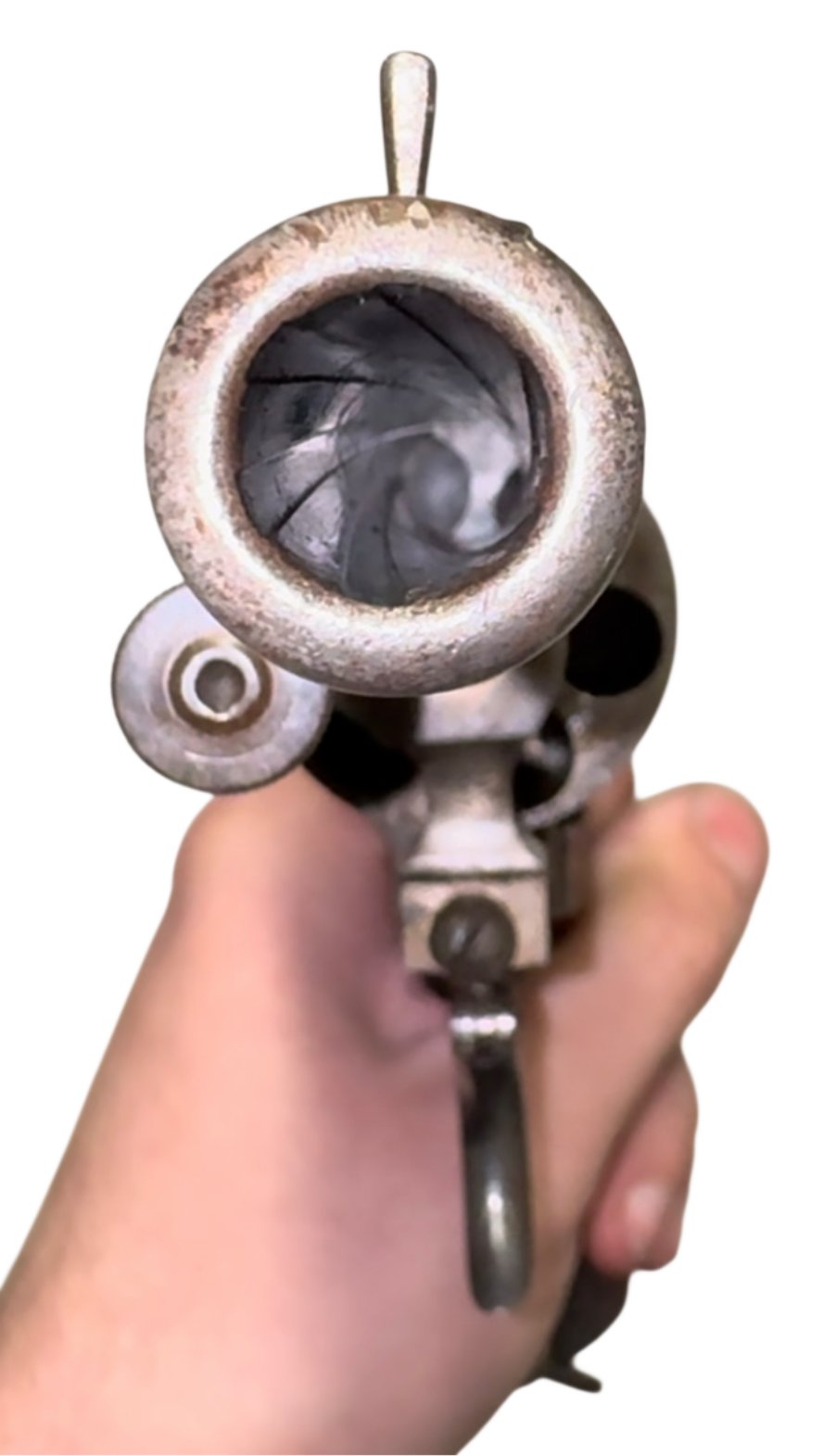 The bore is surprisingly nice for an antique pinfire—clean with a mirror-like shine and approximately 90% overall condition internally