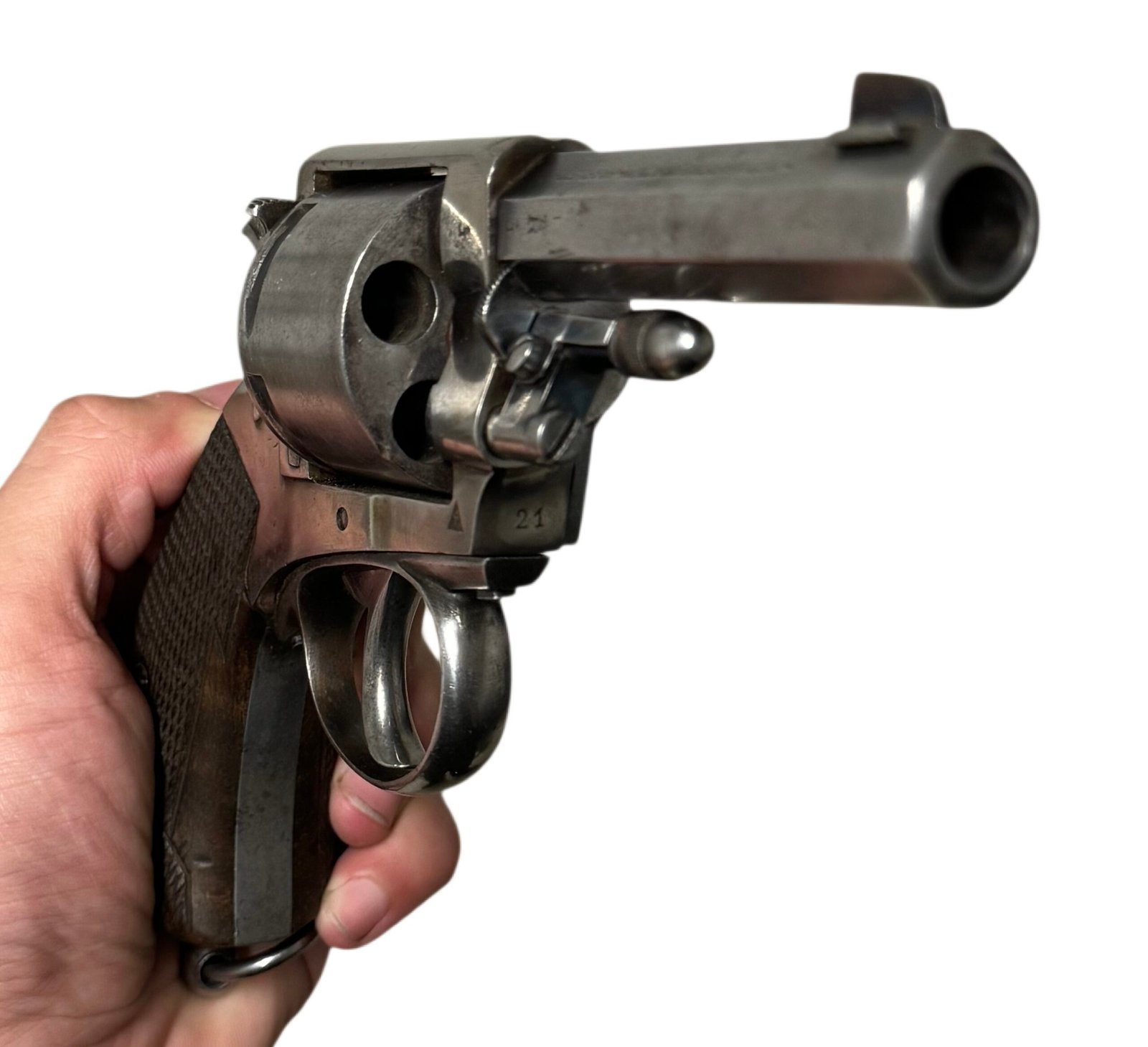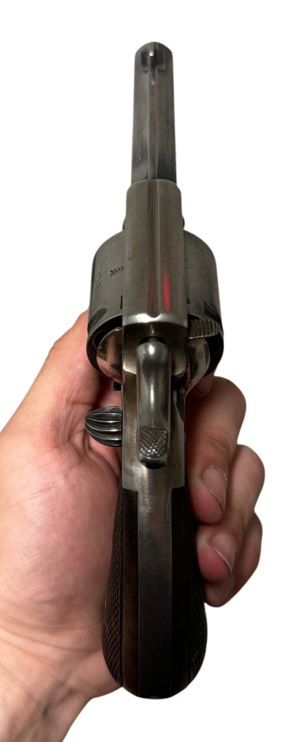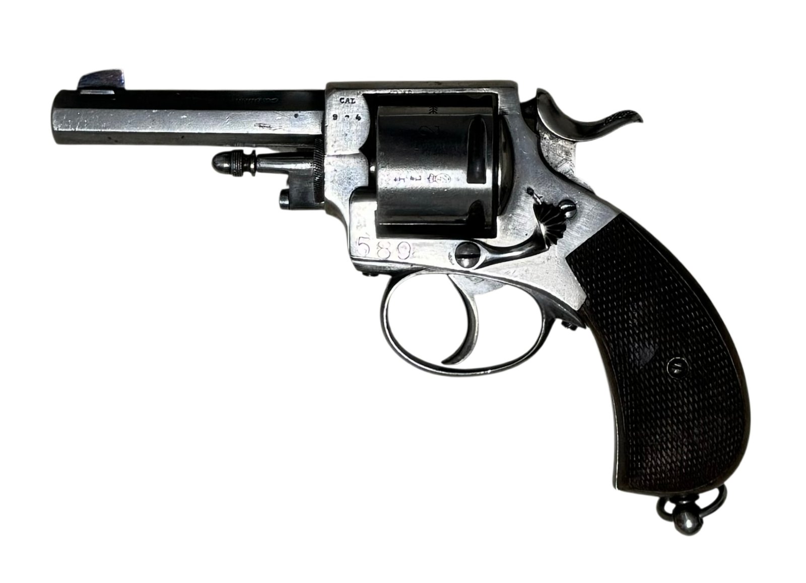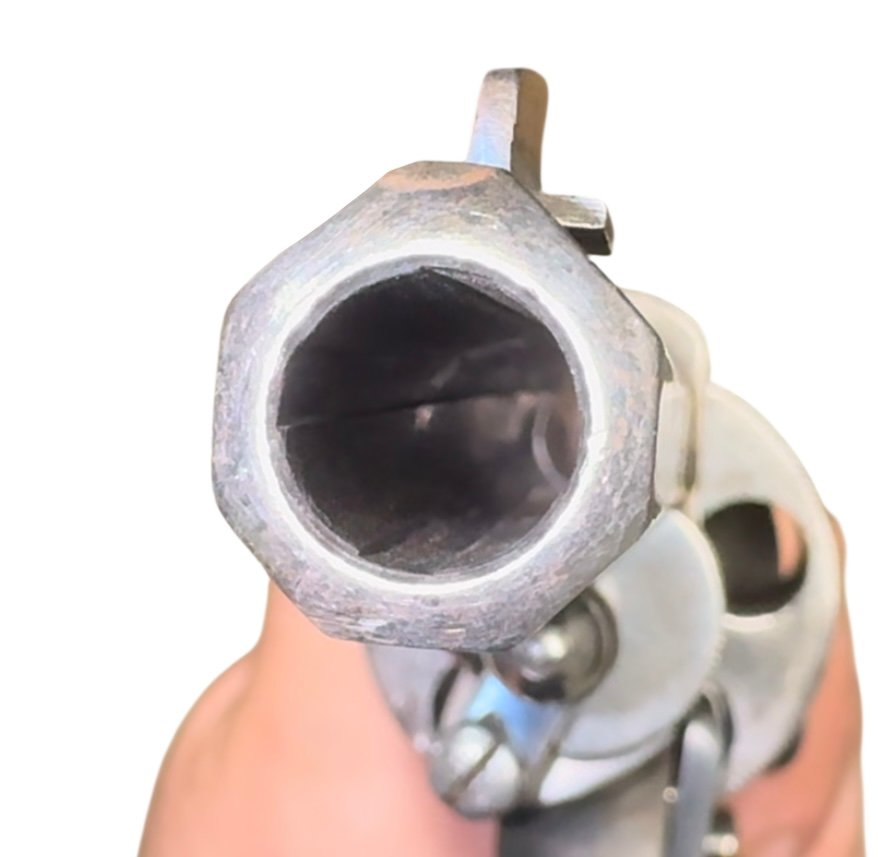 This service pistol features a manual locking safety to secure the cylinder, original nickel-plated finish with no flaking, and well-preserved grips