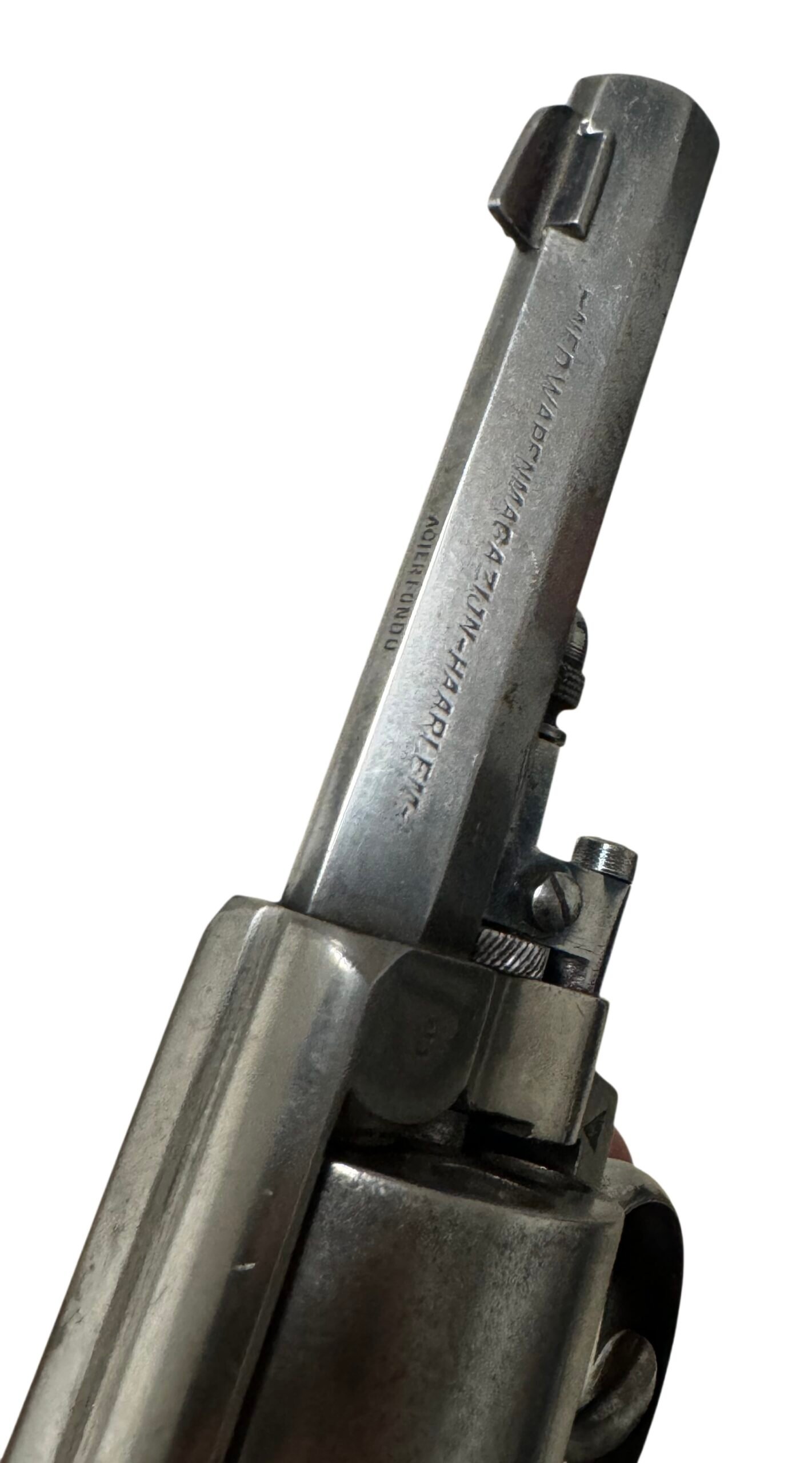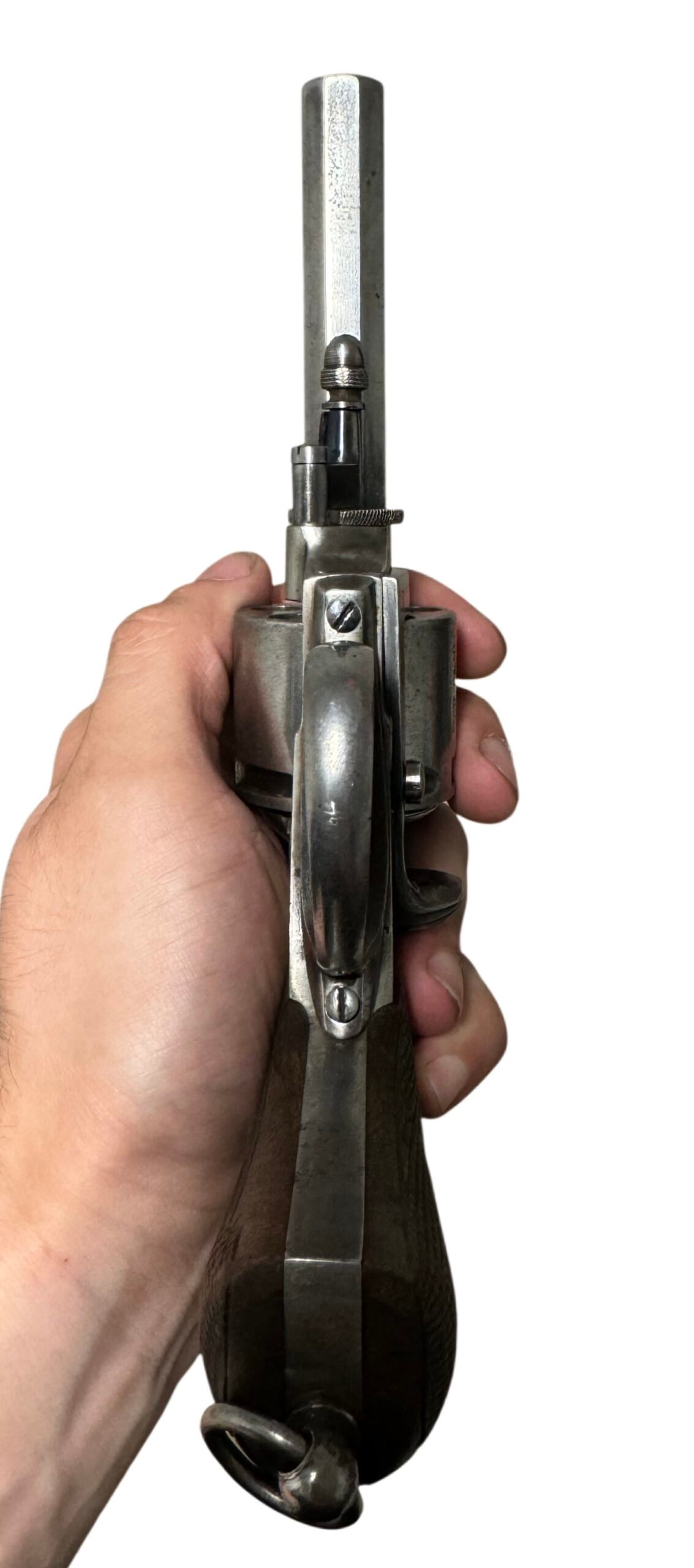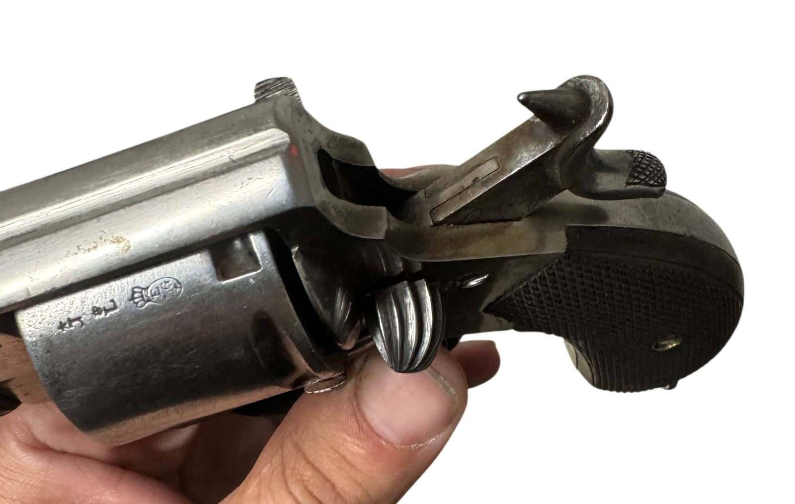 This service pistol features a manual locking safety to secure the cylinder, original nickel-plated finish with no flaking, and well-preserved grips