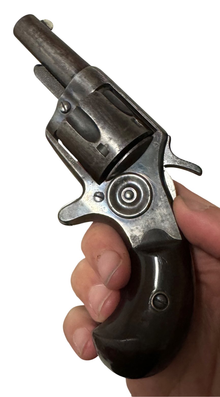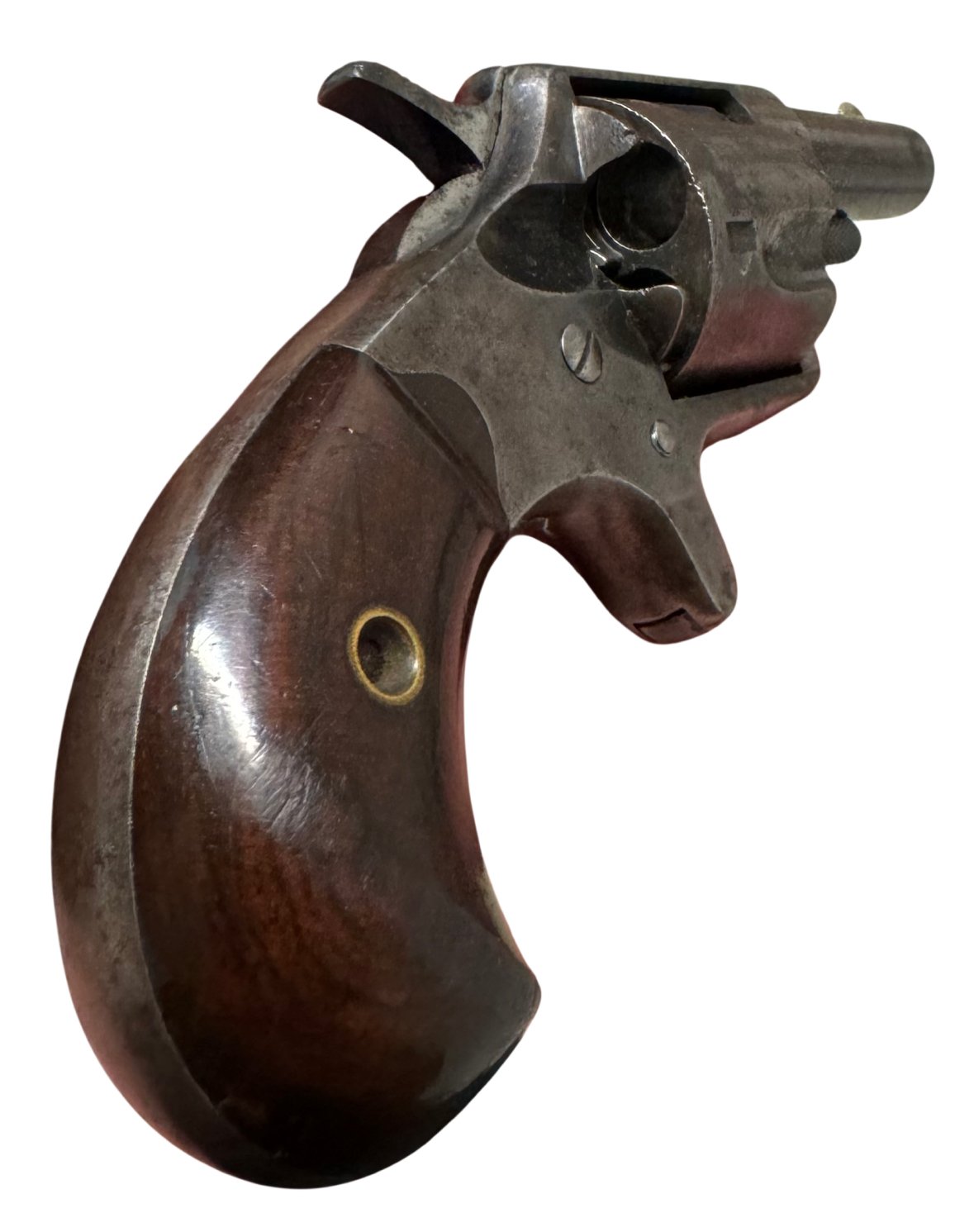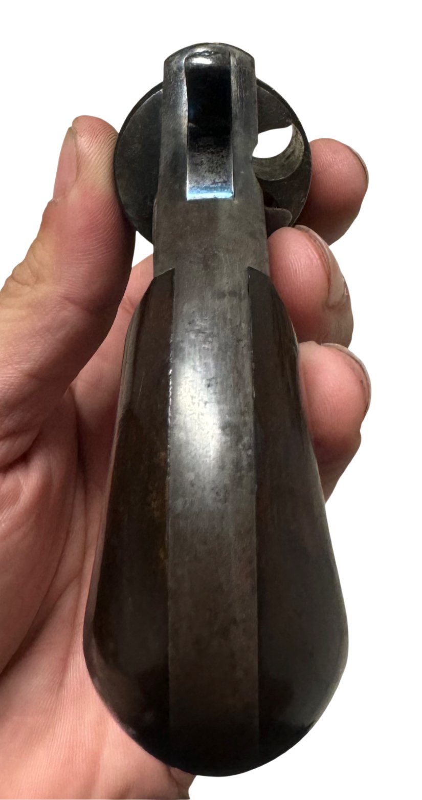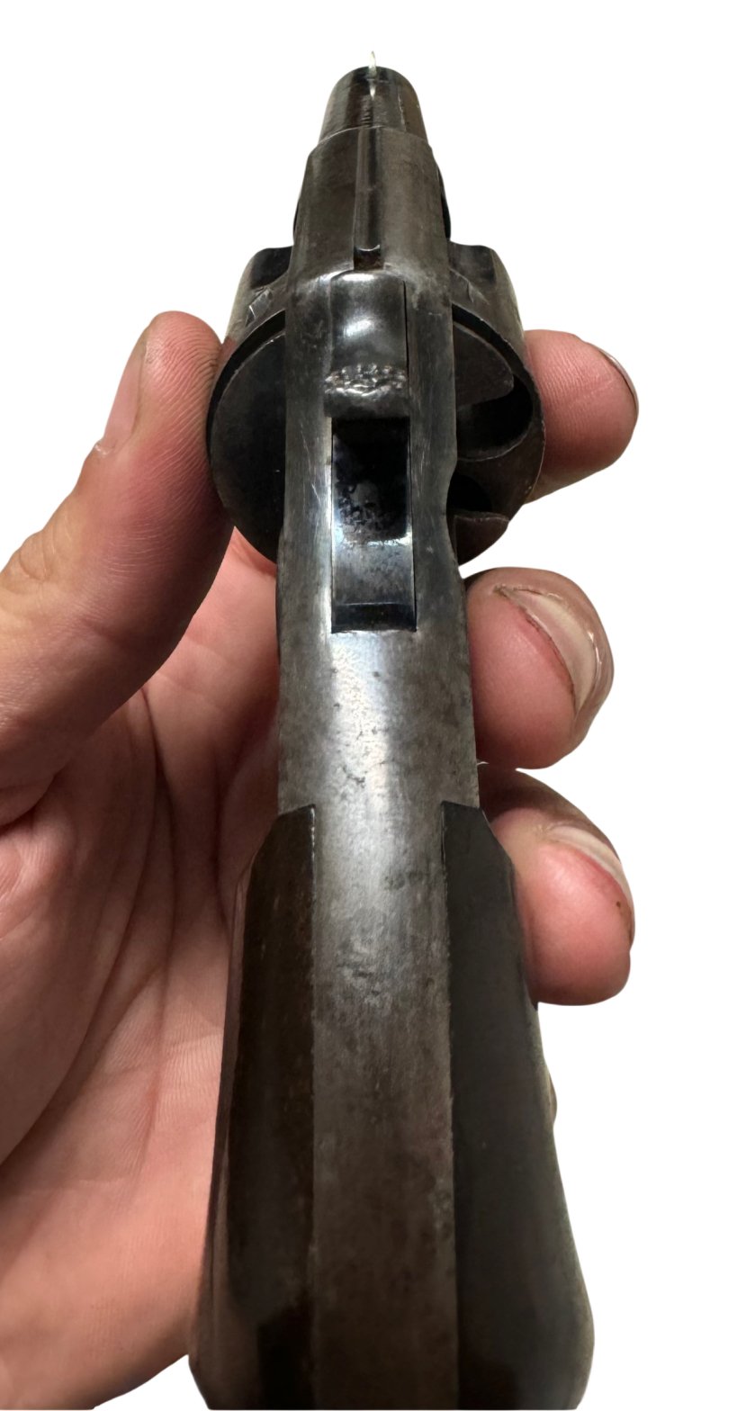 Condition: Retains traces of original blue and case color finish, with light nitre blue visible on the trigger, hammer, and screws. Bore is clean with well-defined lands and grooves. Grips show minor wear but no chips or cracks