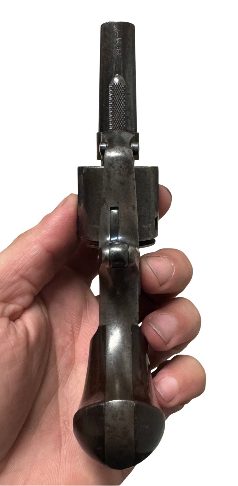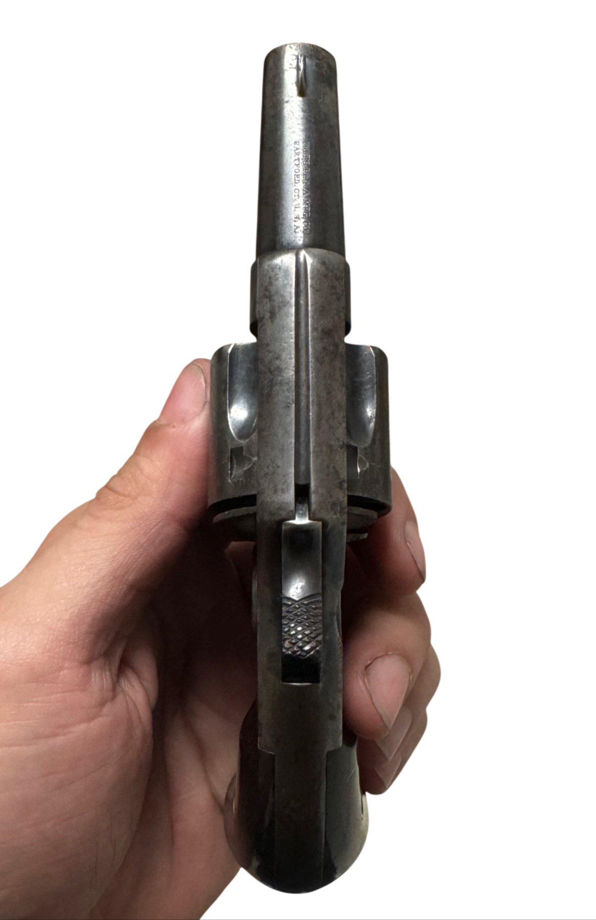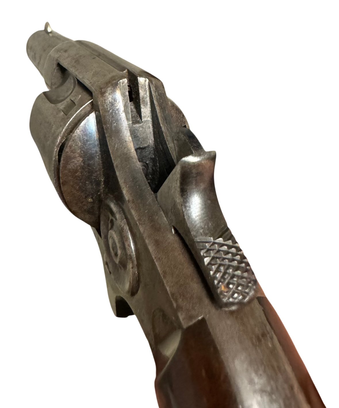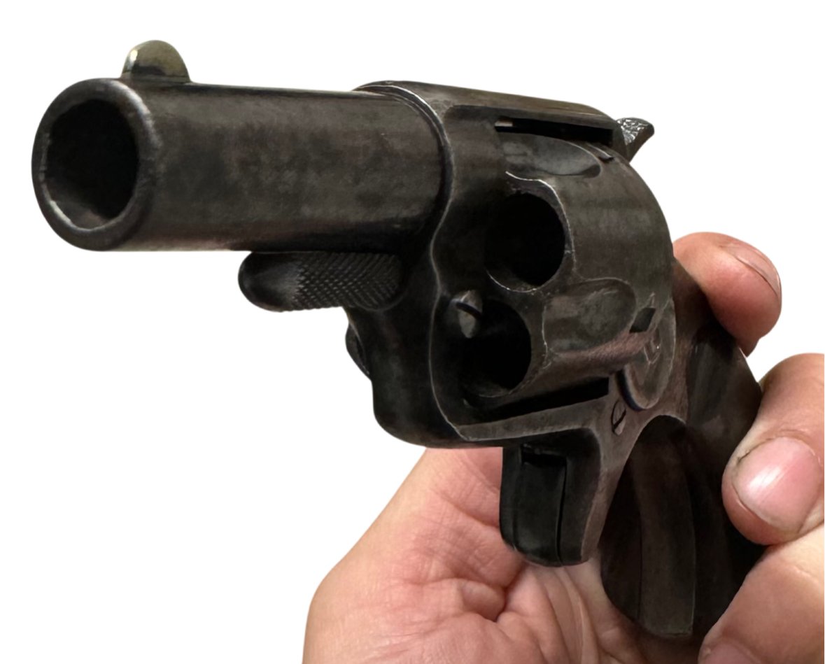Condition: Retains traces of original blue and case color finish, with light nitre blue visible on the trigger, hammer, and screws. Bore is clean with well-defined lands and grooves. Grips show minor wear but no chips or cracks