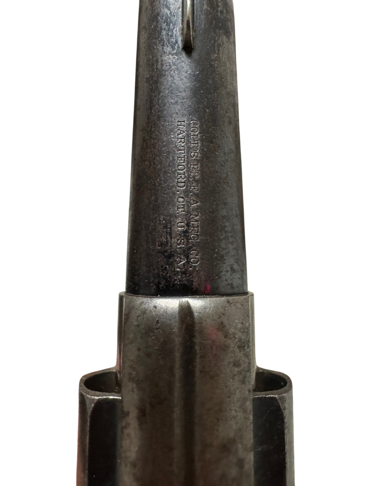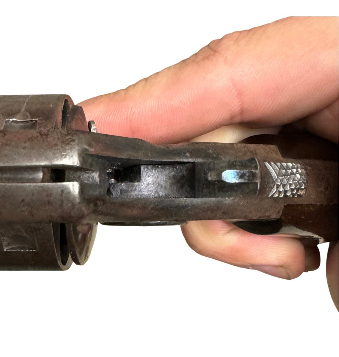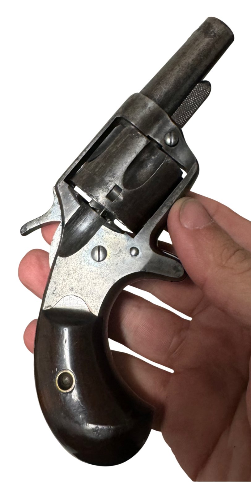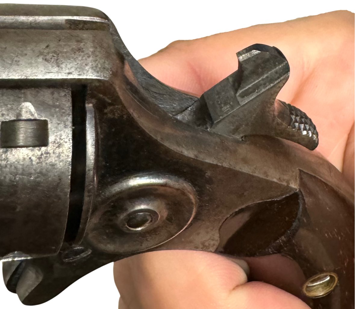 Condition: Retains traces of original blue and case color finish, with light nitre blue visible on the trigger, hammer, and screws. Bore is clean with well-defined lands and grooves. Grips show minor wear but no chips or cracks